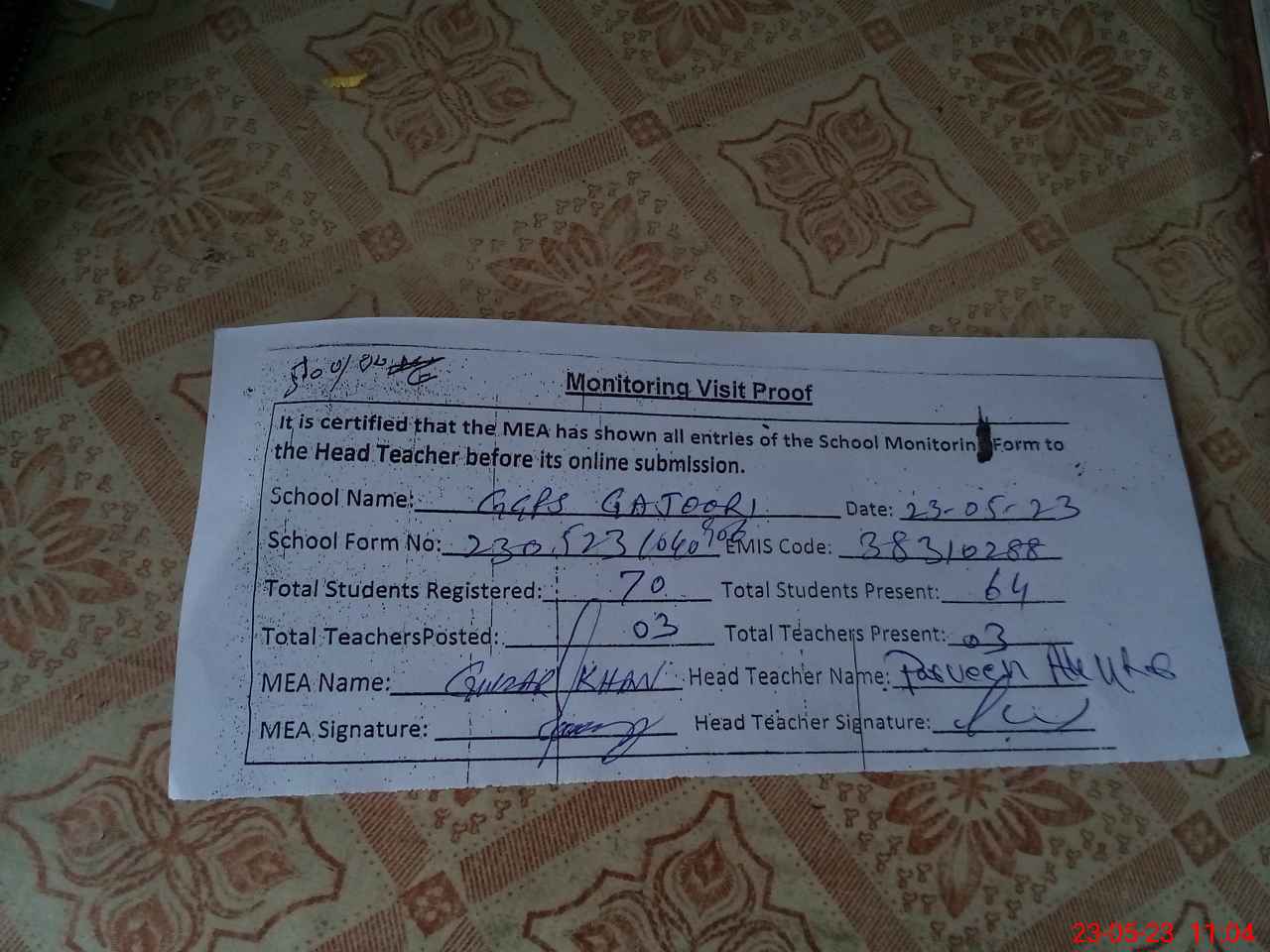 | Attendance Register | Head Teacher | MEA with School | Visit Proof |