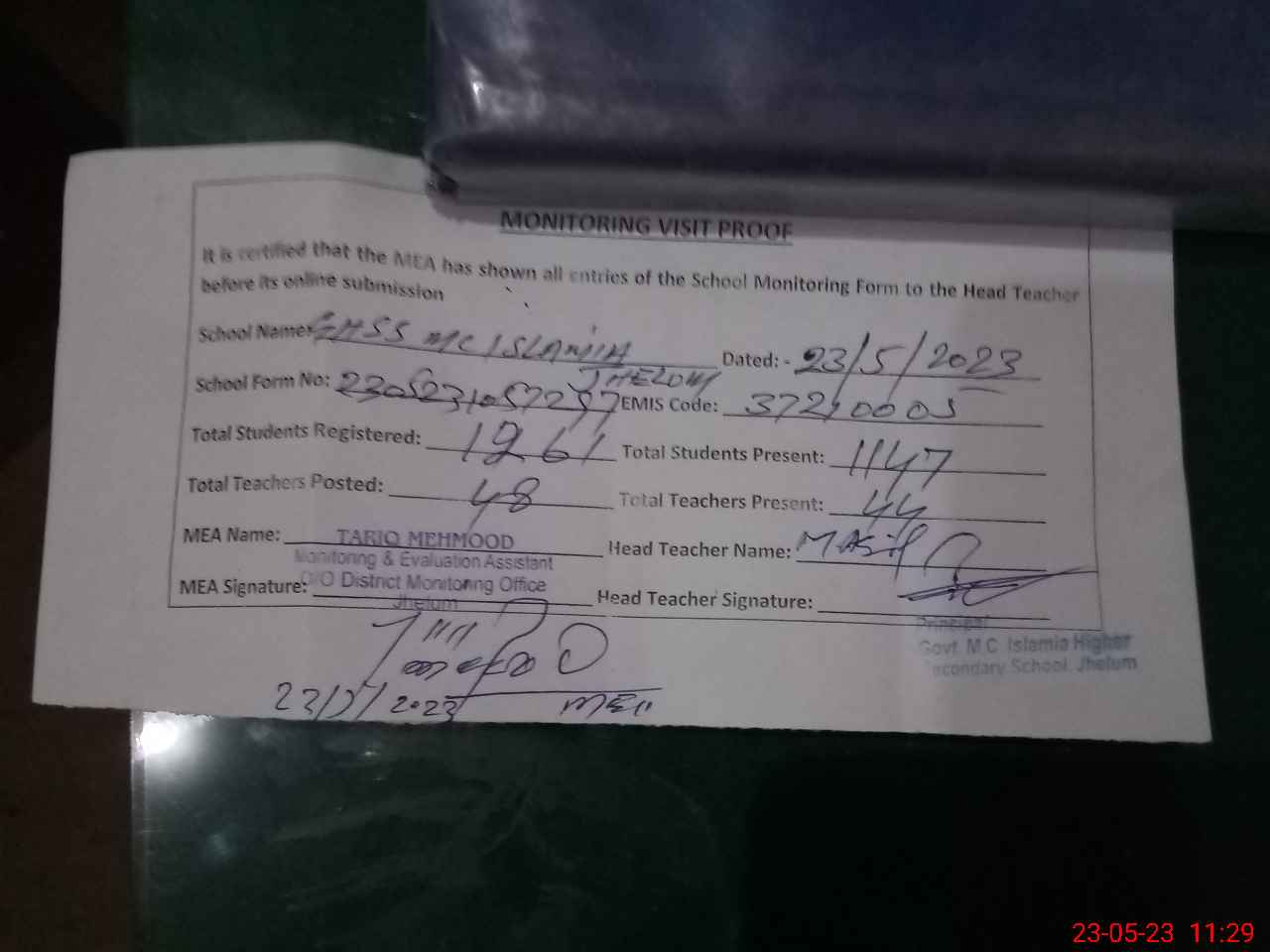 | Attendance Register | Head Teacher | MEA with School | Visit Proof |