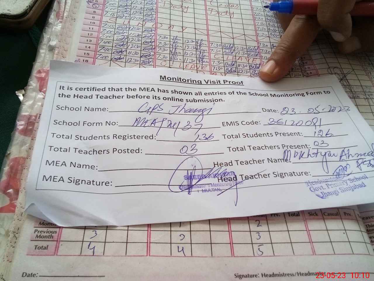 | Attendance Register | Head Teacher | MEA with School | Visit Proof |