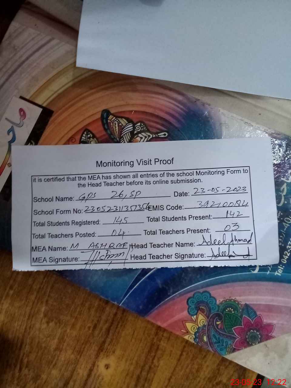 | EMIS Code: 39210084 | Name of School: GPS 26/SP PAKPATTAN | |||