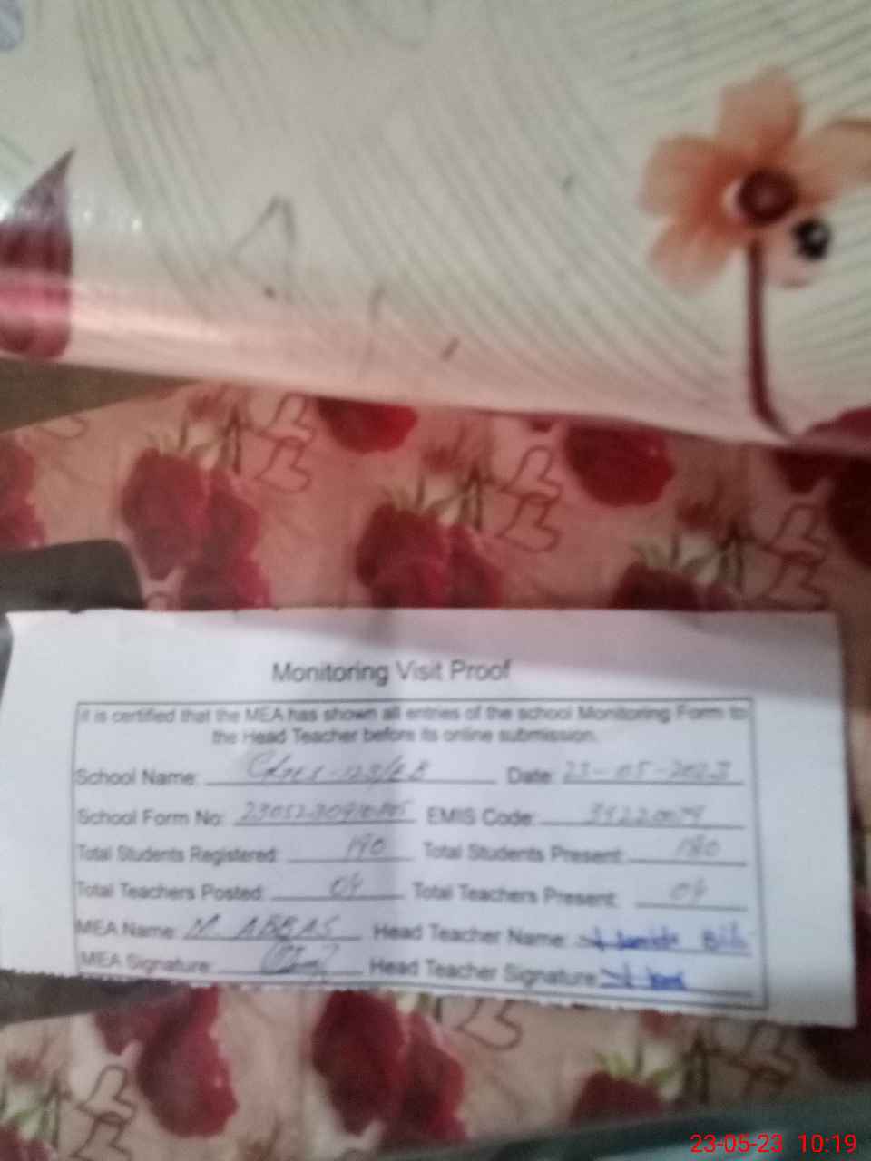 | Attendance Register | Head Teacher | MEA with School | Visit Proof |