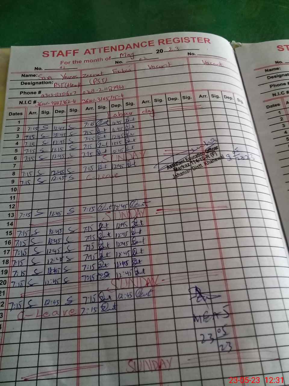 | Remarks (Use Separate Page if Required): Record ftf and nsb not found head teacher on leave boys portion not functional due to no male teacher | |||||