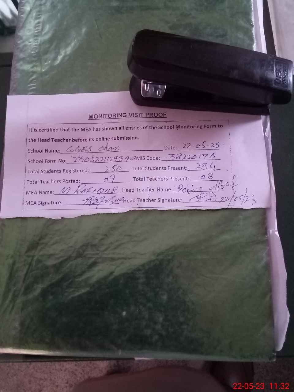 | Attendance Register | Head Teacher | MEA with School | Visit Proof |