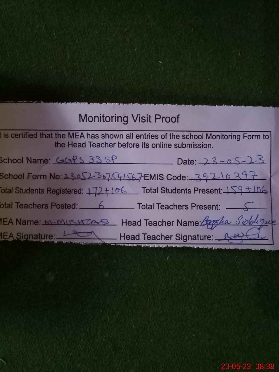 | Attendance Register | Head Teacher | MEA with School | Visit Proof |