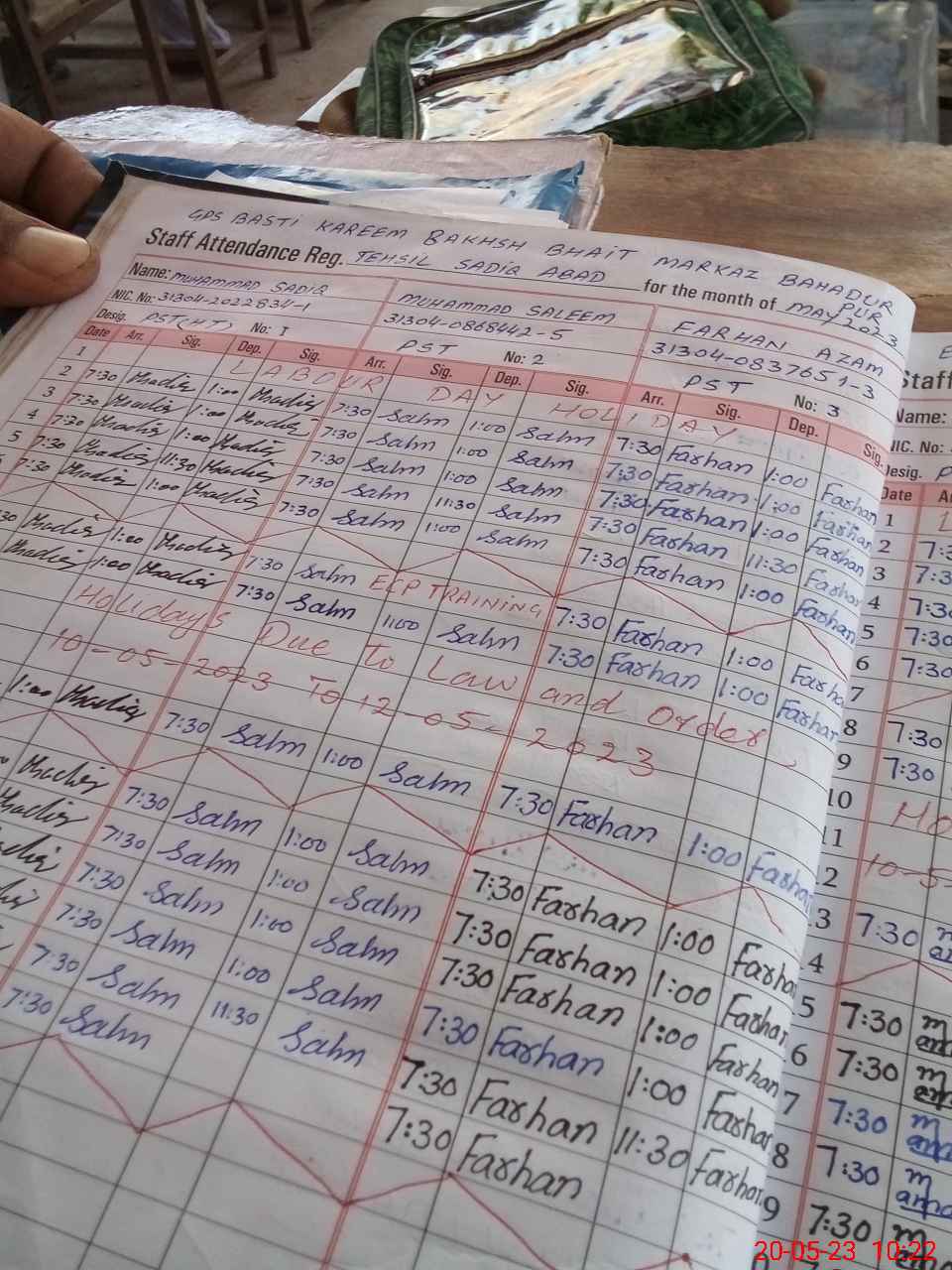| CNIC | Full Name | Designation | R/C | Absence during last cal. month |