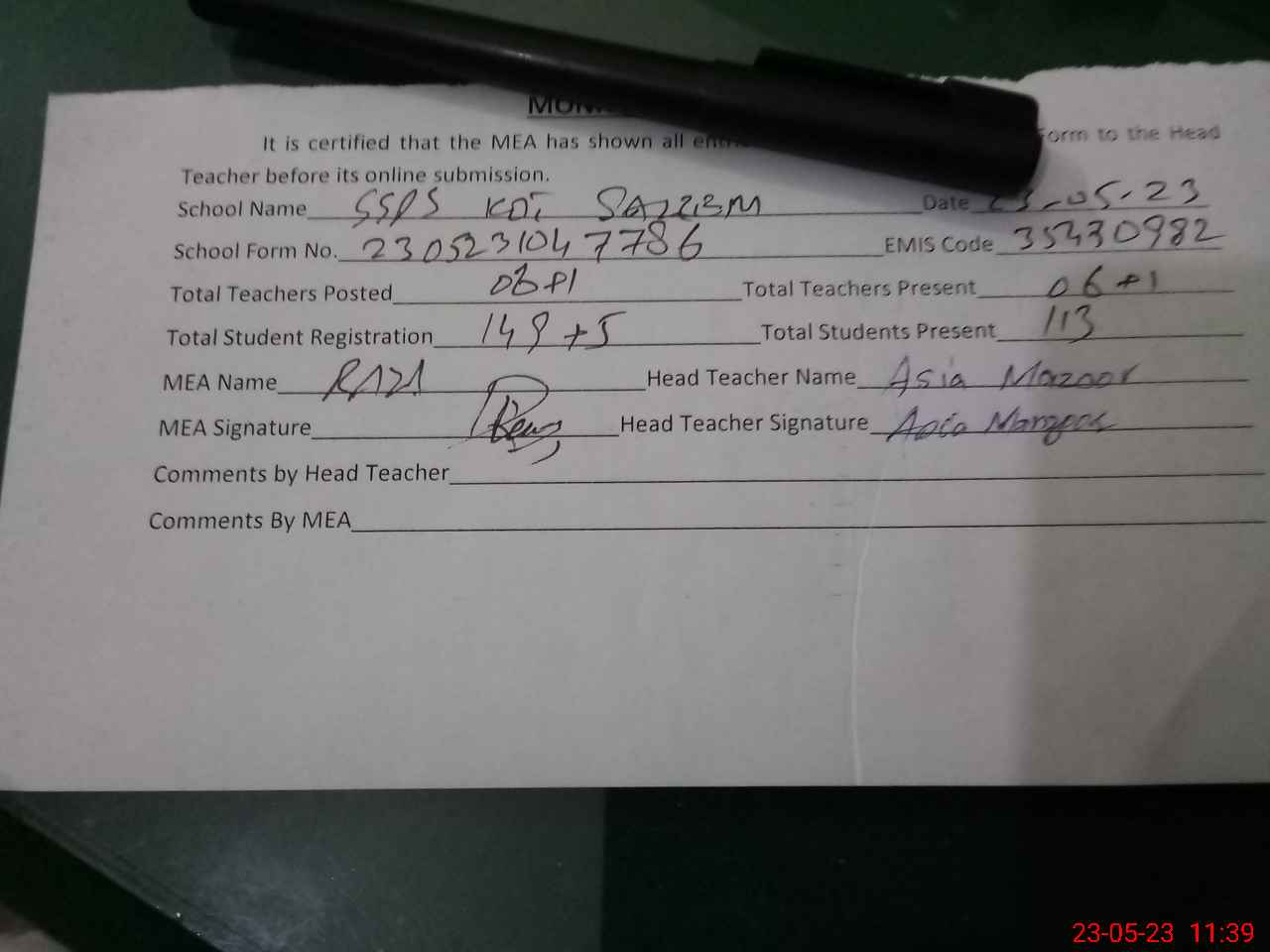| Attendance Register | Head Teacher | MEA with School | Visit Proof |