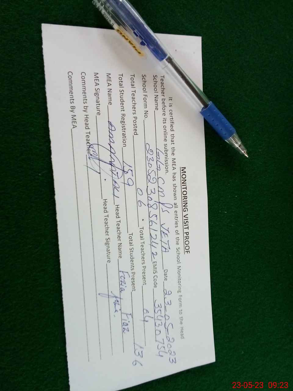 | Attendance Register | Head Teacher | MEA with School | Visit Proof |