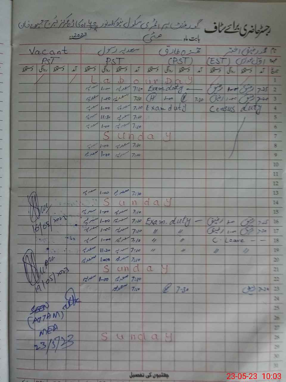 | CNIC | Full Name | Designation | R/C | Absence During Last Calender Month |
