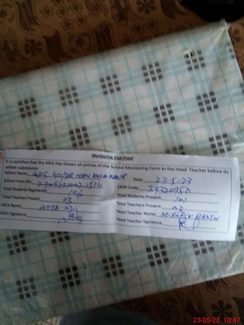 | Attendance Register | Head Teacher | MEA with School | Visit Proof |