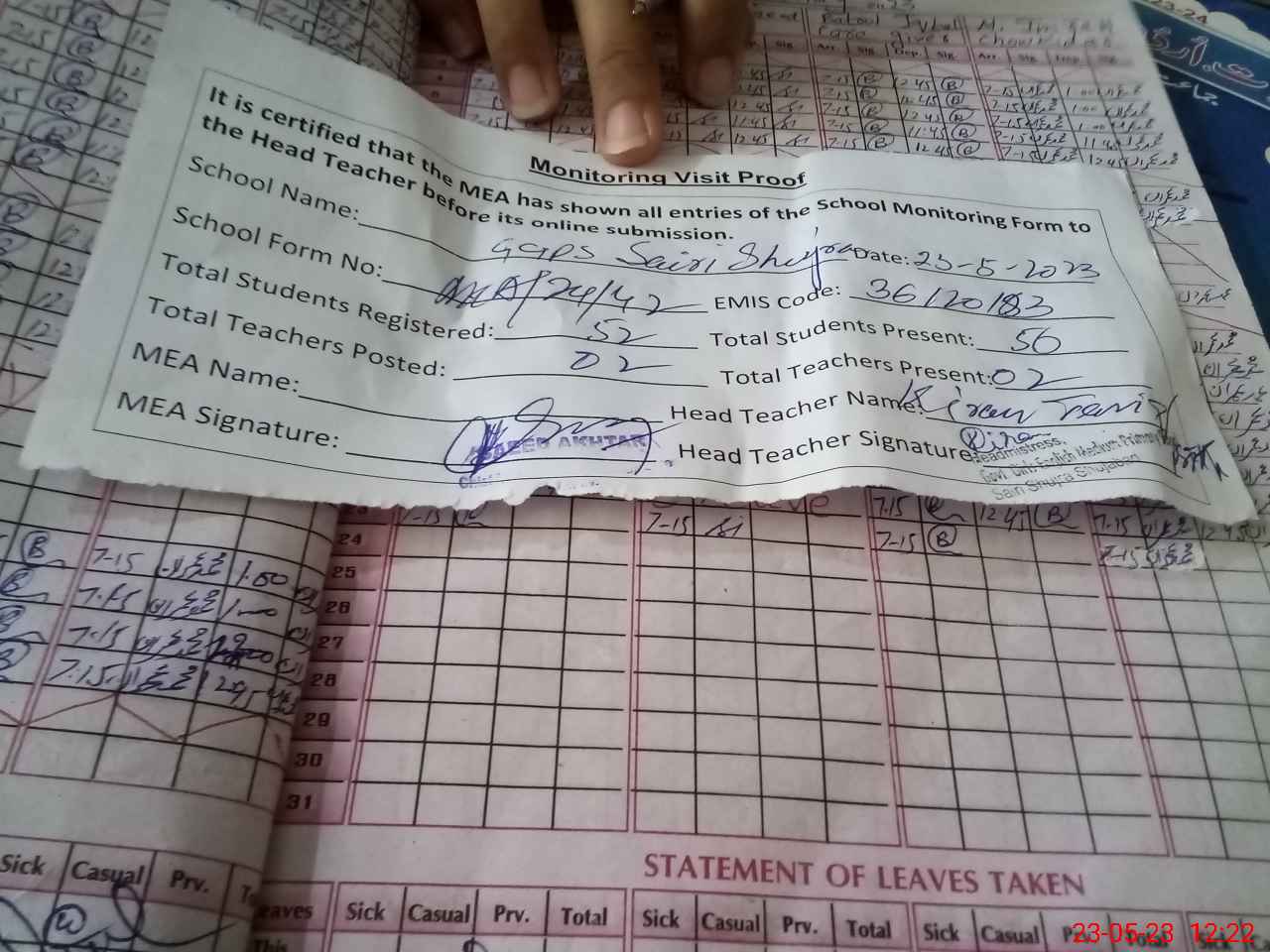 | Attendance Register | Head Teacher | MEA with School | Visit Proof |