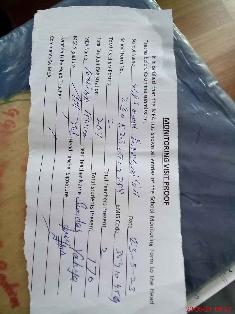 | Attendance Register | Head Teacher | MEA with School | Visit Proof |