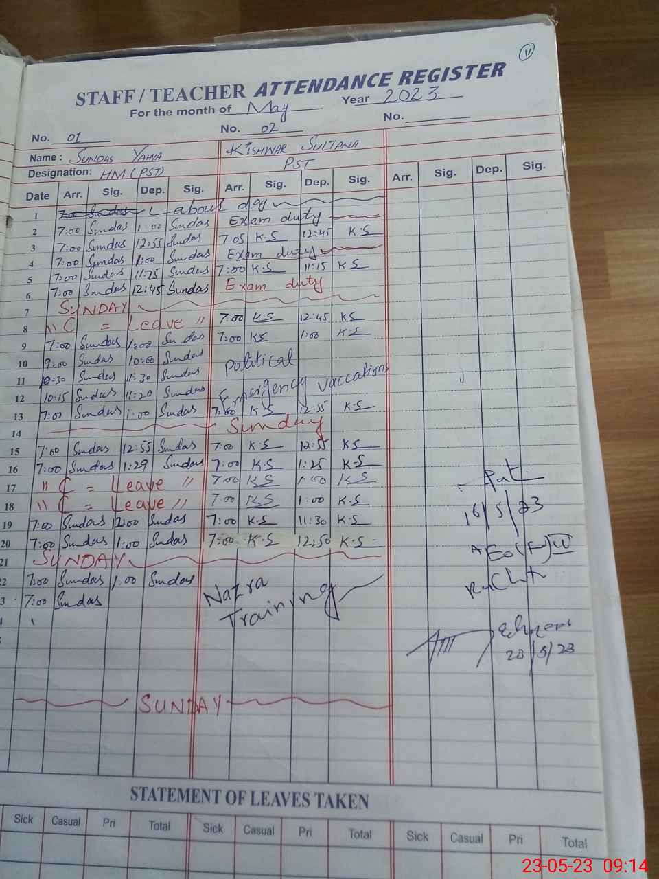 Leave Type | Remarks for today (Leave,Training, Exam,Absent,Late, Other duty) |