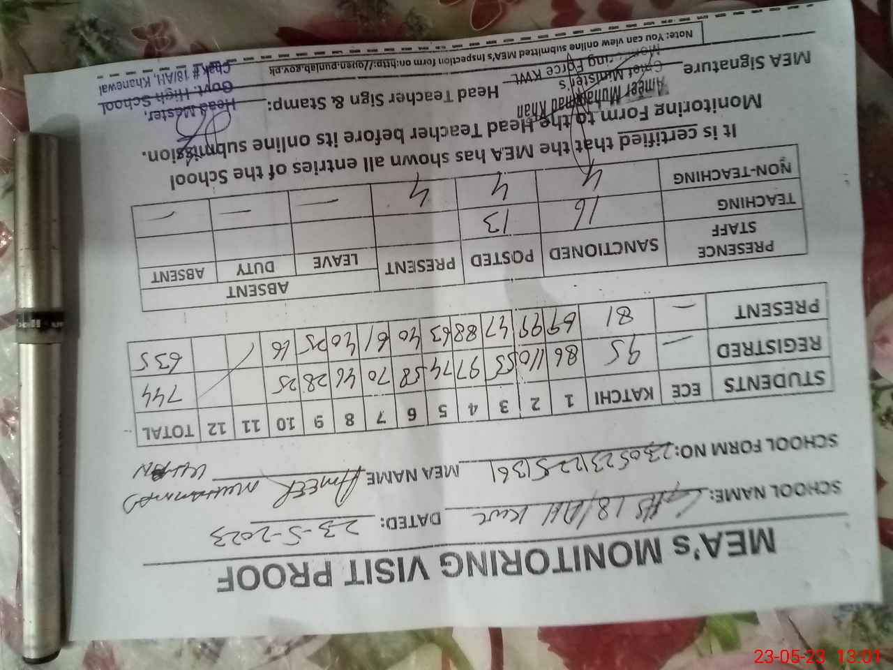 | Attendance Register | Head Teacher | MEA with School | Visit Proof |