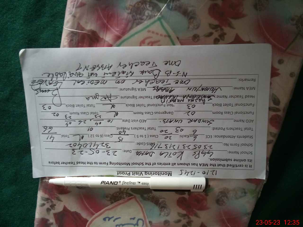 | Remarks (Use Separate Page if Required): One teacher absent attendance marked present in register but not present in school one teacher on medical leave NSB bank statement not available students presence low | |||||