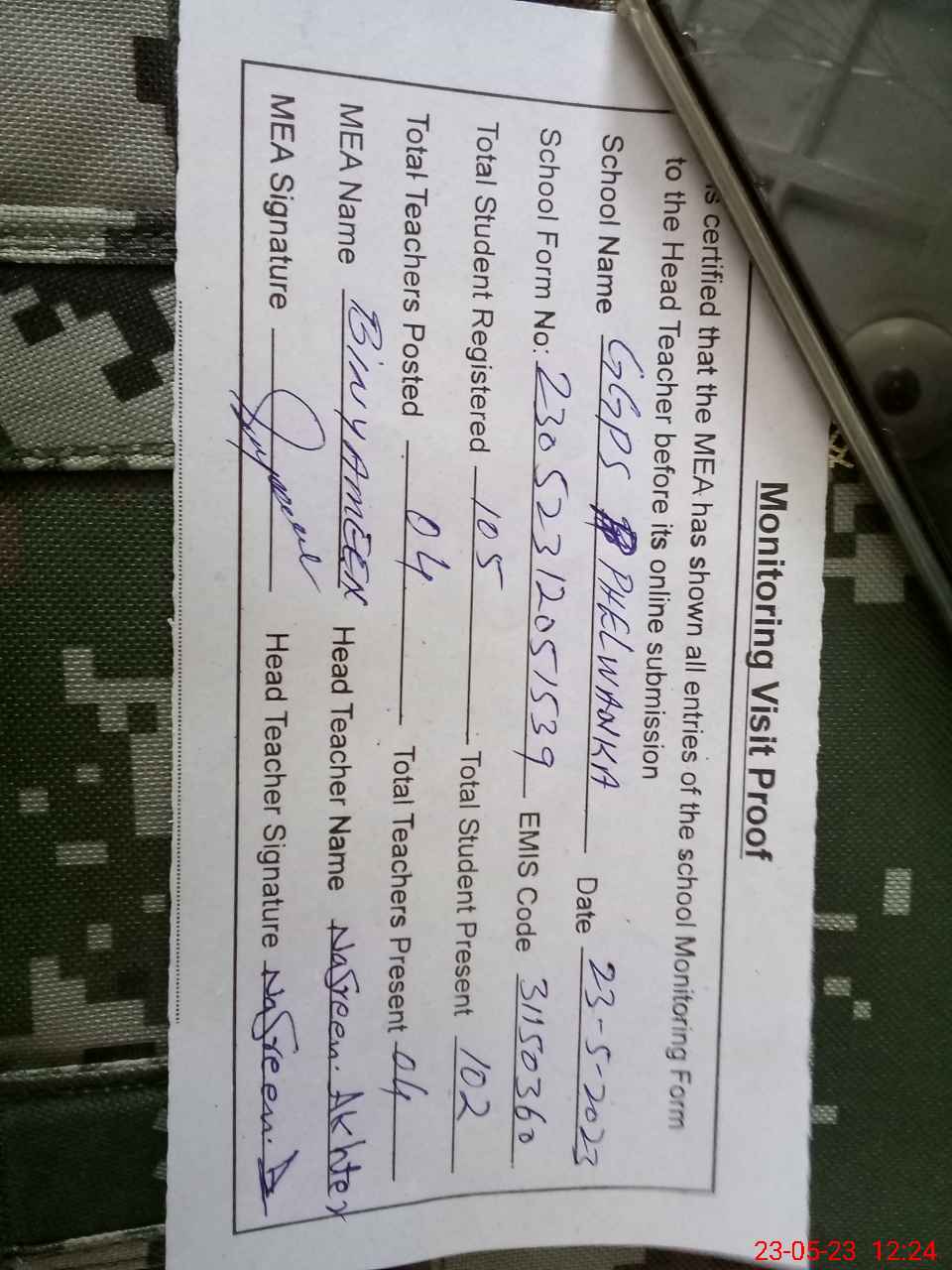 | Attendance Register | Head Teacher | MEA with School | Visit Proof |