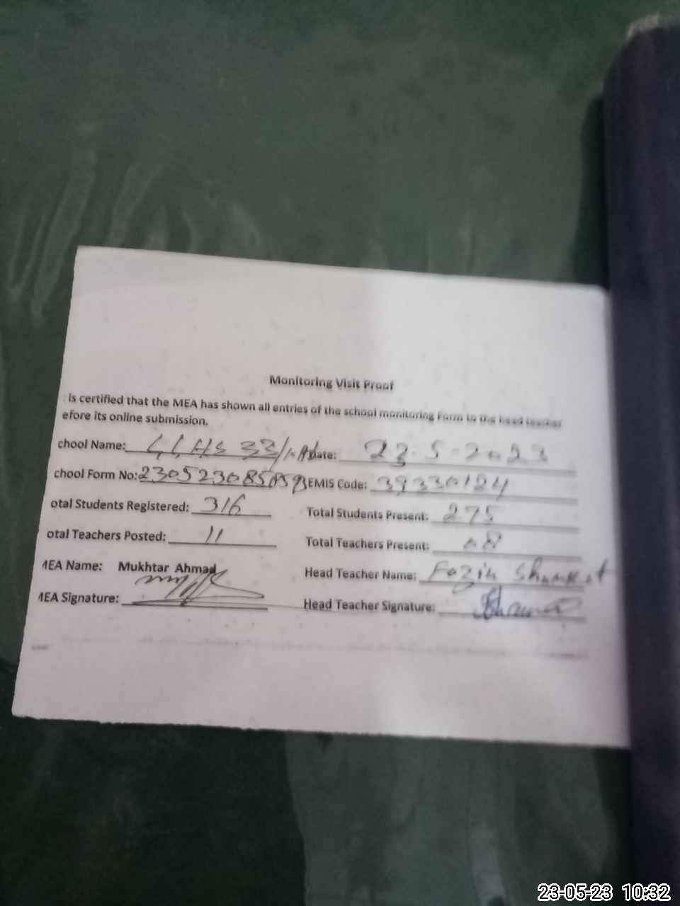 | Attendance Register | Head Teacher | MEA with School | Visit Proof |