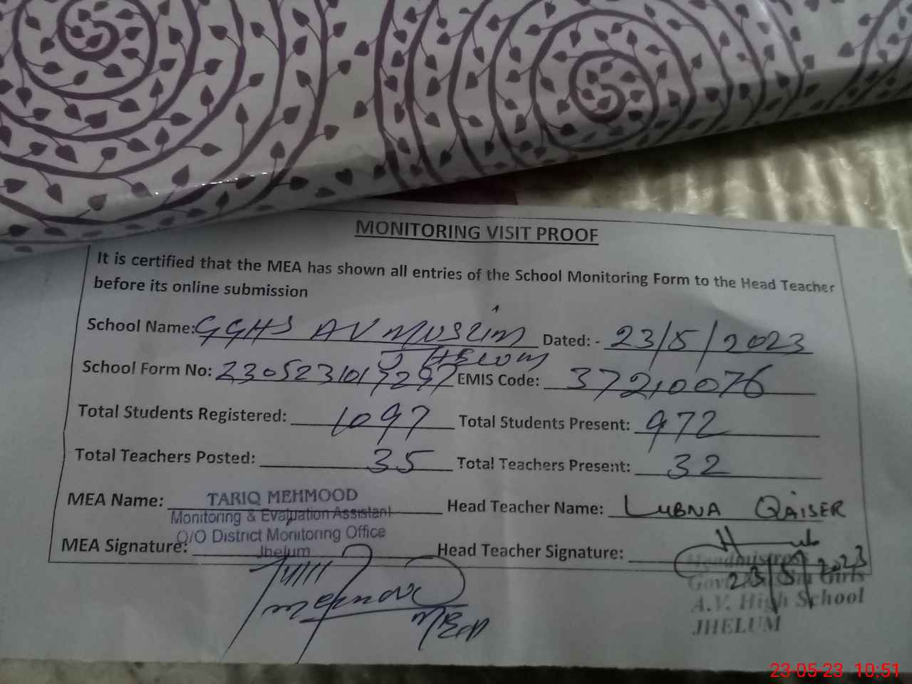 | EMIS Code: 37210076 | Name of School: GGHS AV MUSLIM JHELUM | |||
