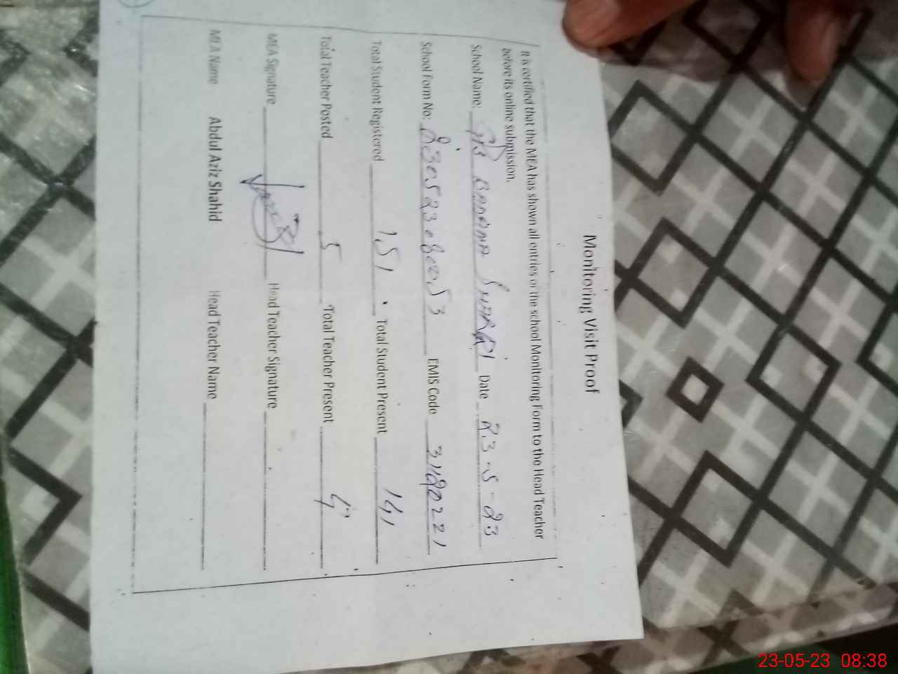 | Attendance Register | Head Teacher | MEA with School | Visit Proof |