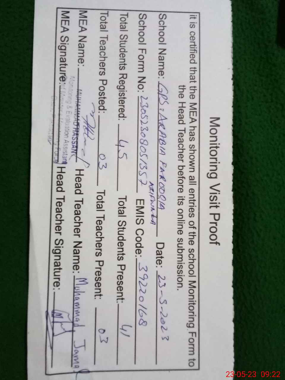 | Attendance Register | Head Teacher | MEA with School | Visit Proof |