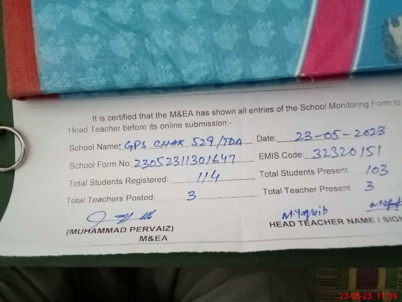 | EMIS Code: 32320151 | Name of School: GPS CHAK NO. 529/TDA | |||
