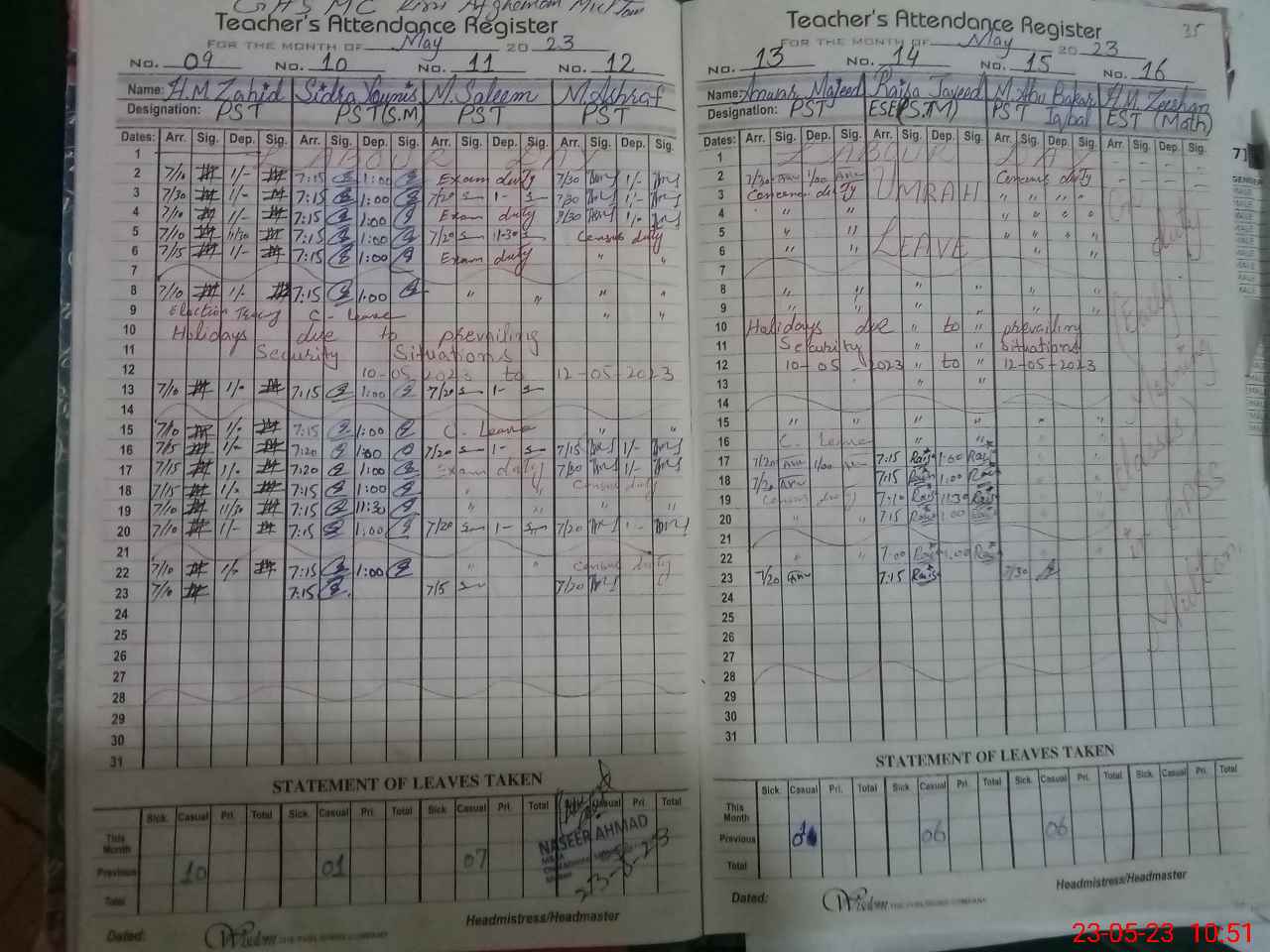| CNIC | Full Name | Designation | R/C | Absence During Last Calender Month |