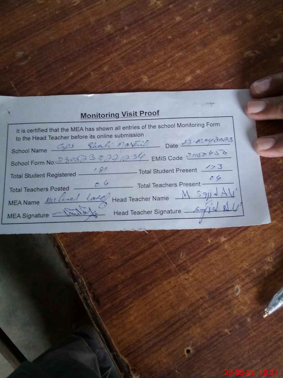 | Attendance Register | Head Teacher | MEA with School | Visit Proof |