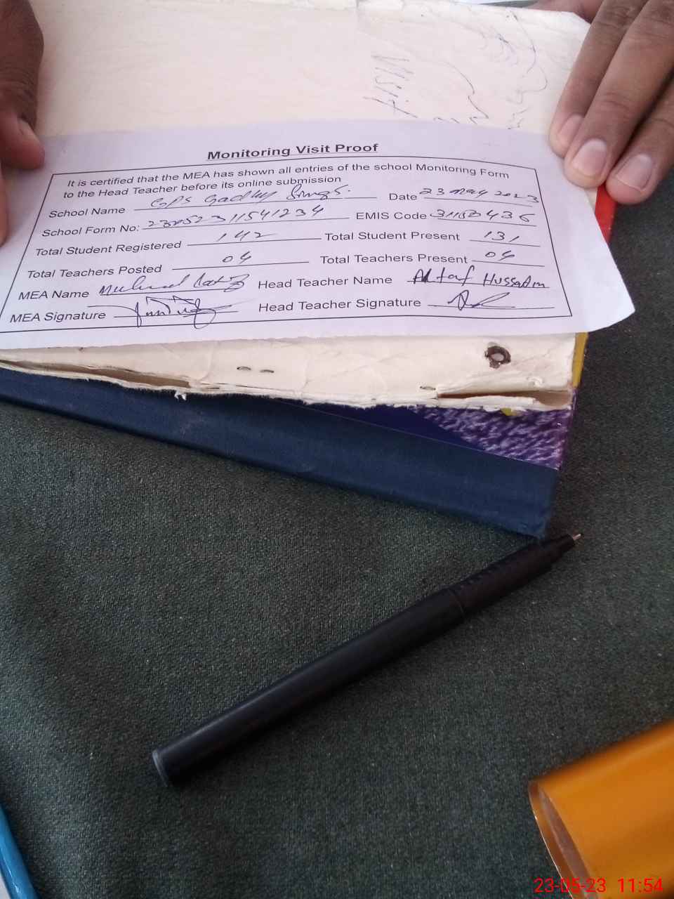 | Attendance Register | Head Teacher | MEA with School | Visit Proof |