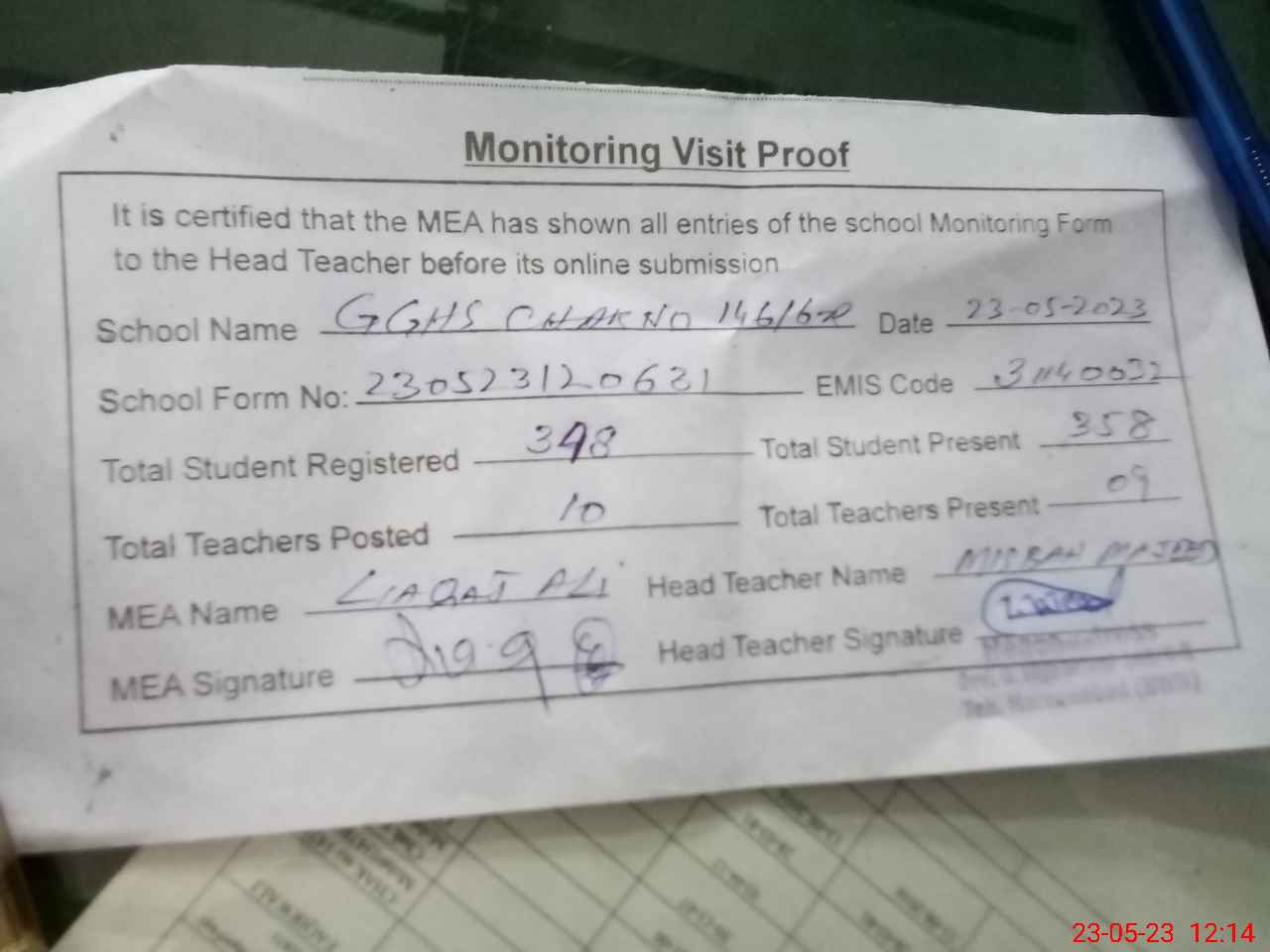 | Attendance Register | Head Teacher | MEA with School | Visit Proof |