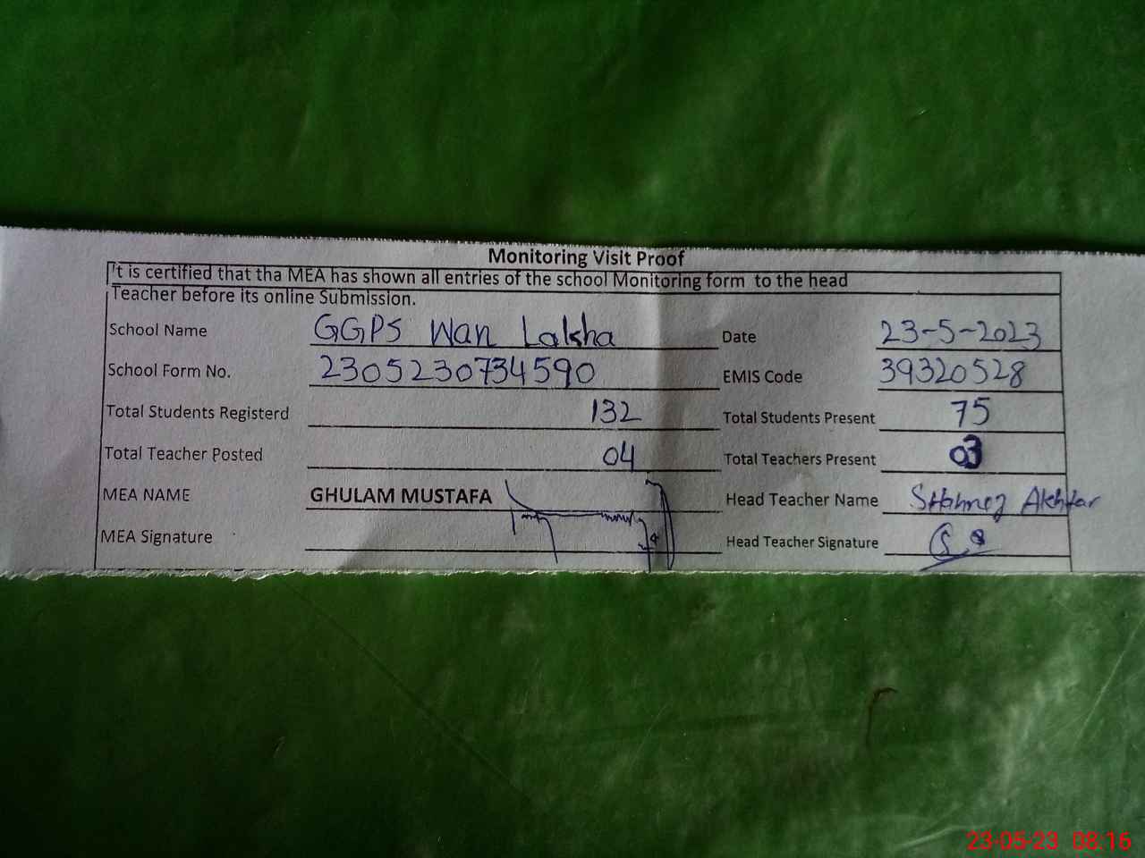 | Attendance Register | Head Teacher | MEA with School | Visit Proof |