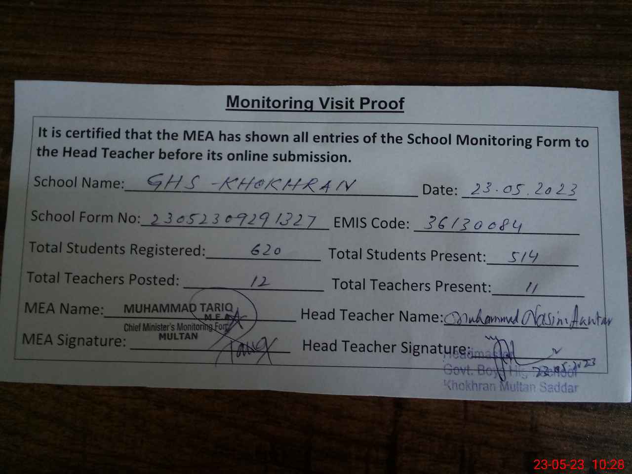 | Attendance Register | Head Teacher | MEA with School | Visit Proof |