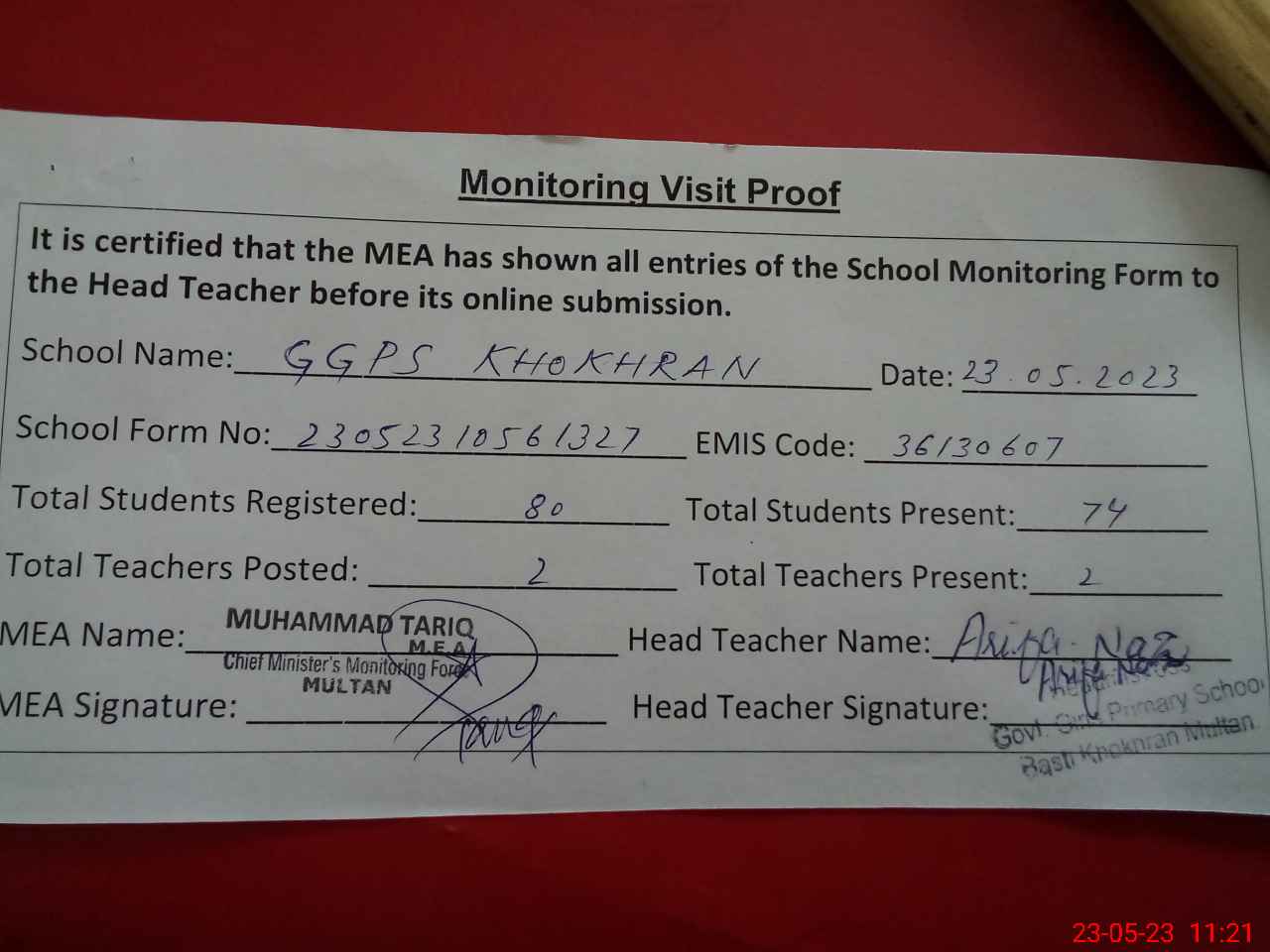 | Attendance Register | Head Teacher | MEA with School | Visit Proof |