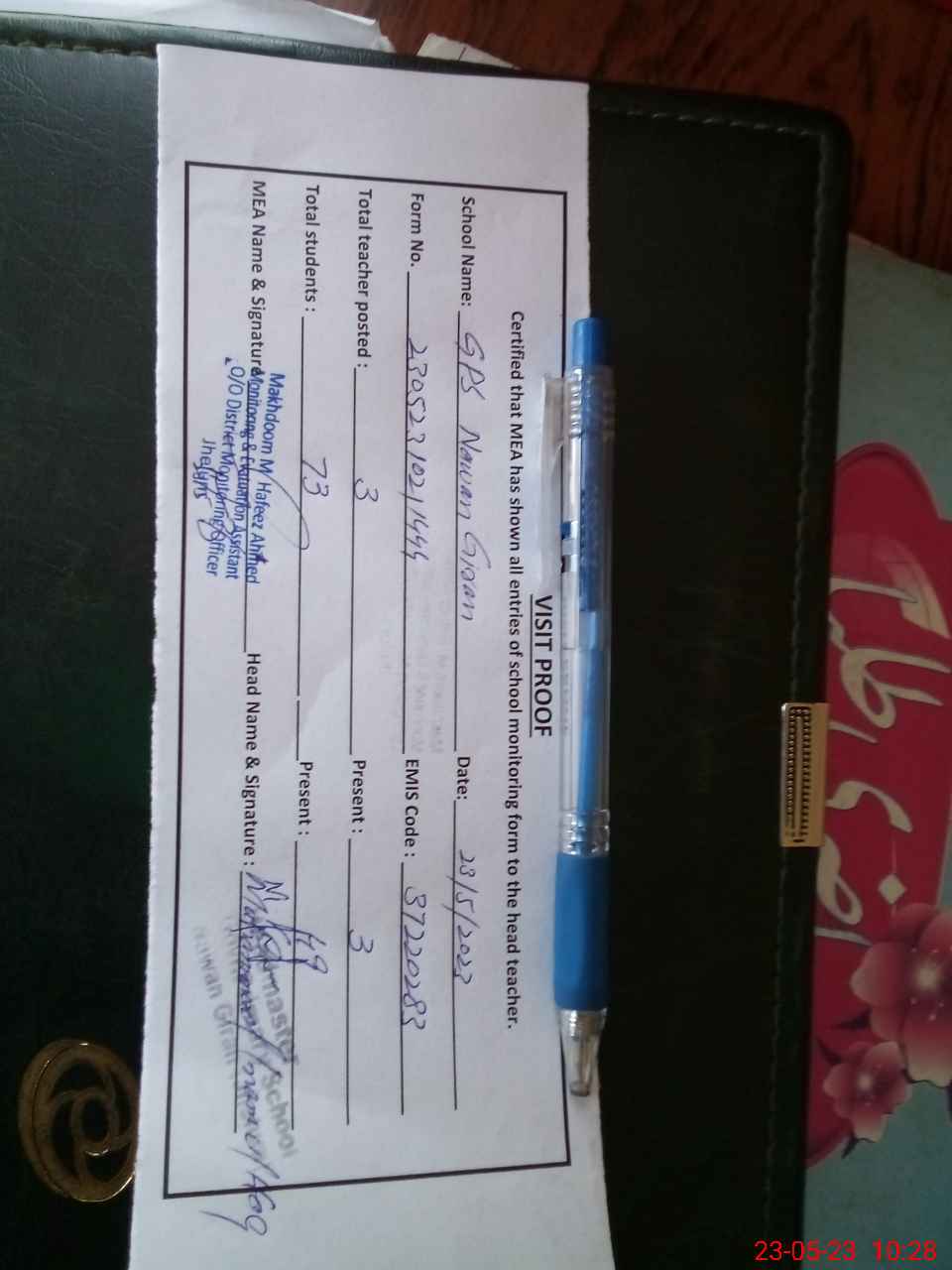 | Remarks (Use Separate Page if Required): Sir Attendance register class 1 to 5 from date 16 April 2023 to 30 April uncompleted Dateed 23 May 2023 Attendance register incomplete no attendance of students on attendance register Dateed 23 May 2023 Roznamacha not maintained Sallery record of Khakroob from NSB not maintained No attendance record of Khakroob from NSB | |||||