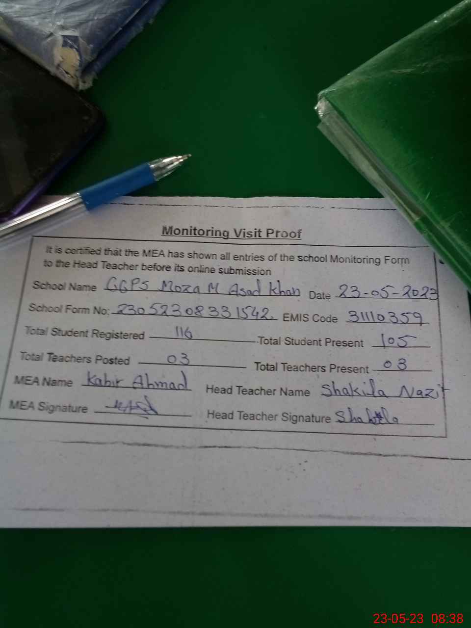 | Attendance Register | Head Teacher | MEA with School | Visit Proof |