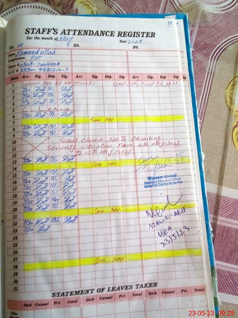 | CNIC | Full Name | Designation | R/C | Absence During Last Calender Month |