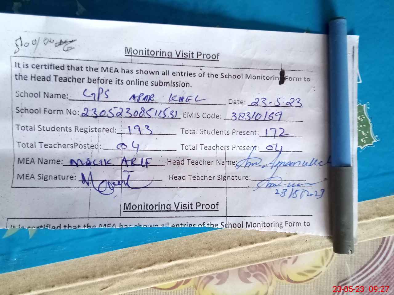 | Attendance Register | Head Teacher | MEA with School | Visit Proof |