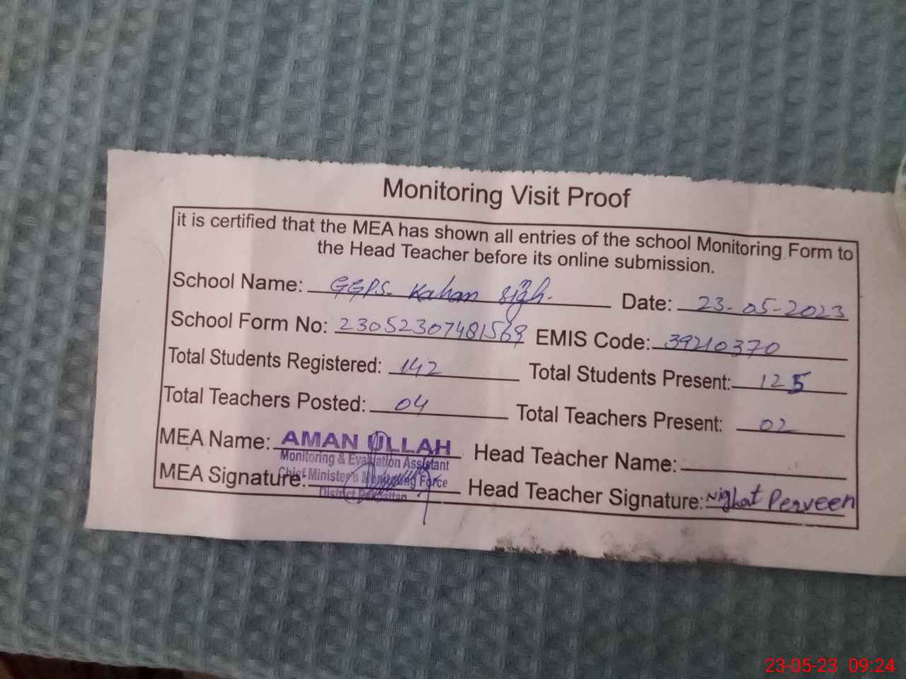 | Attendance Register | Head Teacher | MEA with School | Visit Proof |