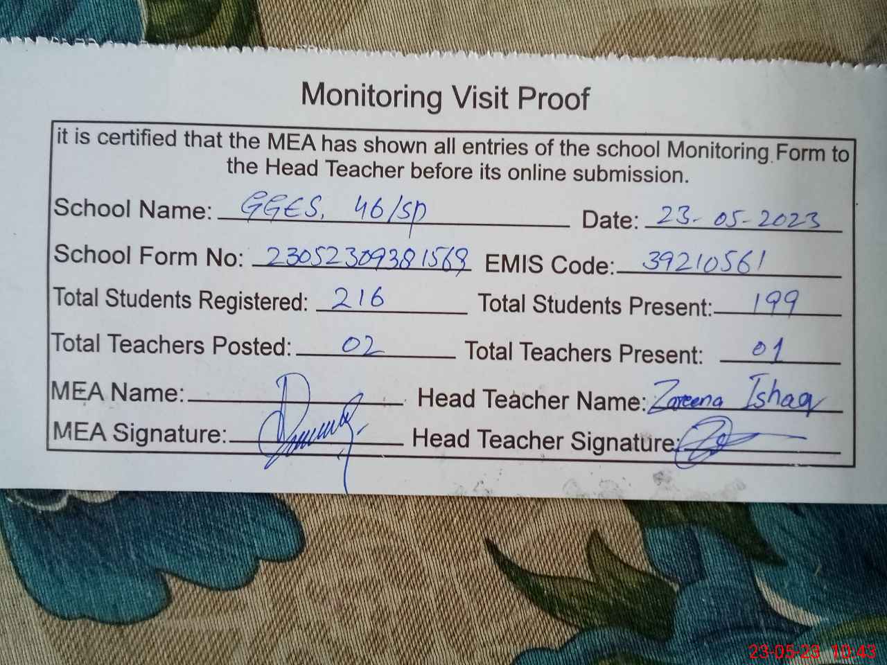 | Attendance Register | Head Teacher | MEA with School | Visit Proof |