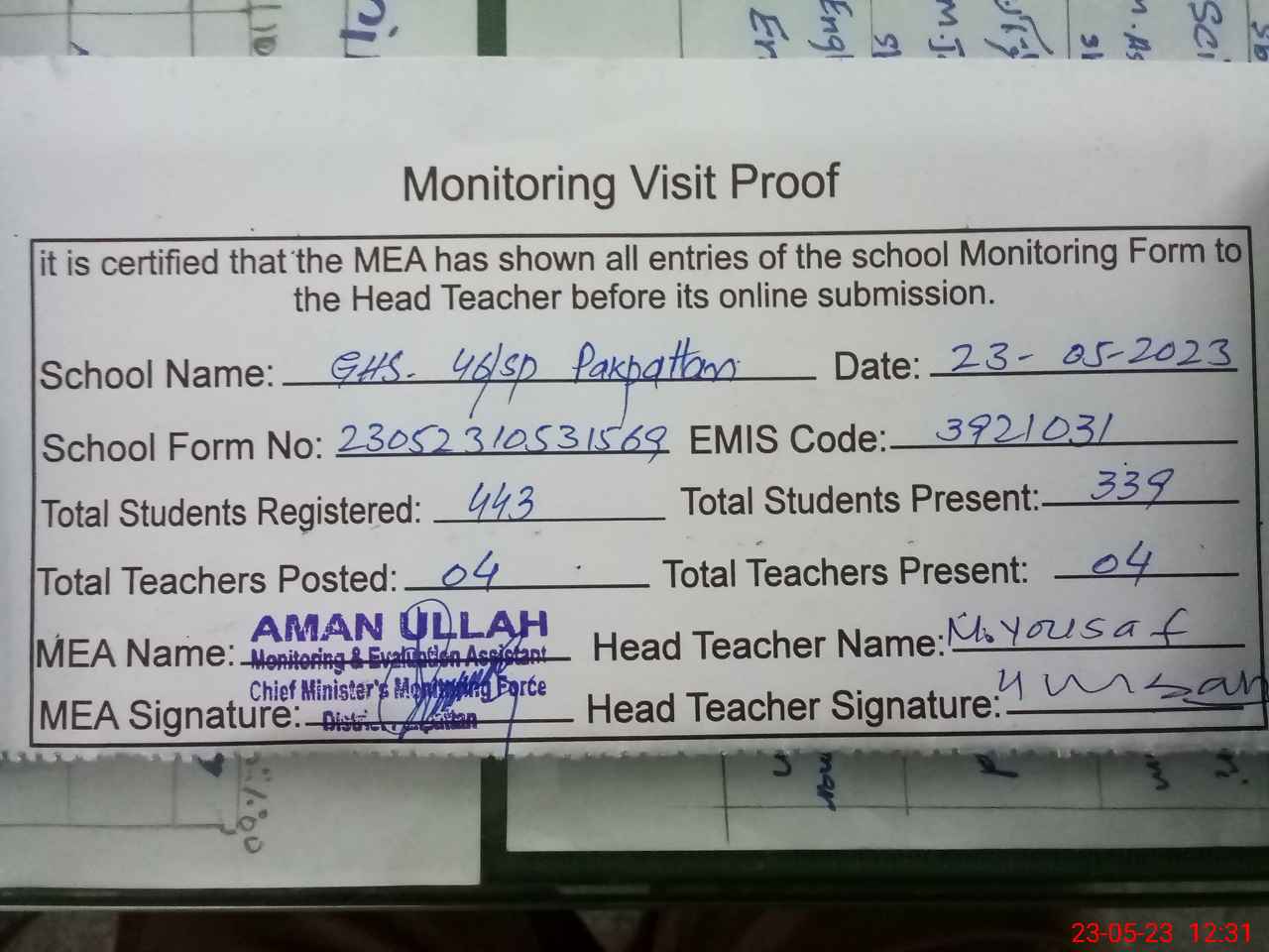 | Attendance Register | Head Teacher | MEA with School | Visit Proof |