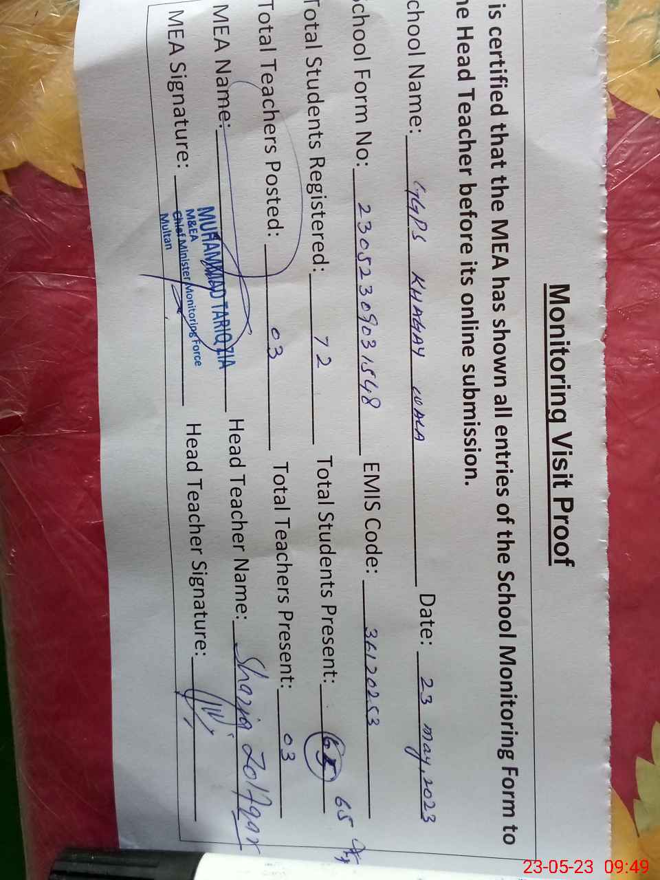 | Attendance Register | Head Teacher | MEA with School | Visit Proof |