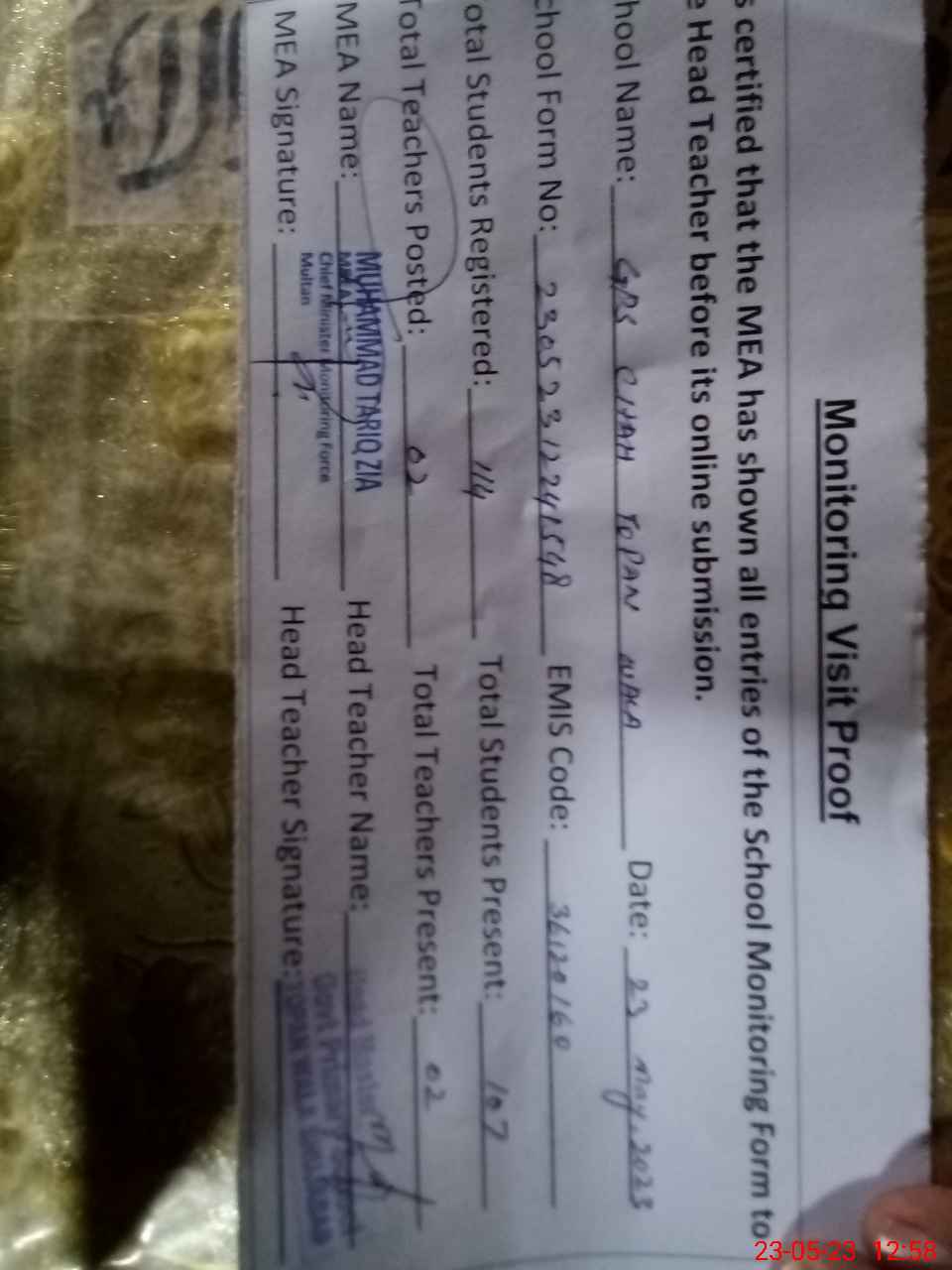 | Attendance Register | Head Teacher | MEA with School | Visit Proof |
