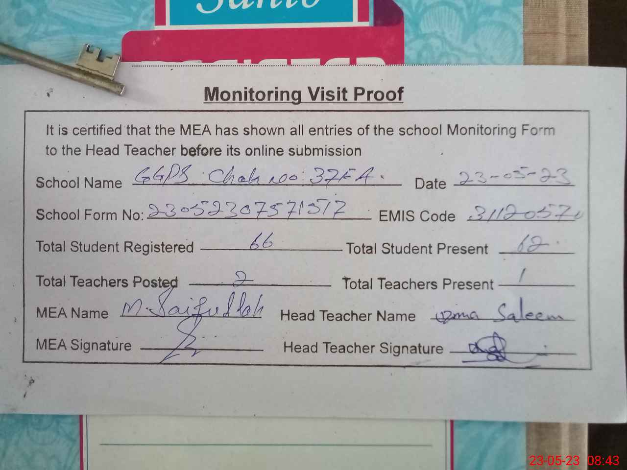 | Attendance Register | Head Teacher | MEA with School | Visit Proof |