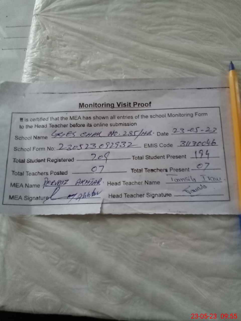 | Attendance Register | Head Teacher | MEA with School | Visit Proof |
