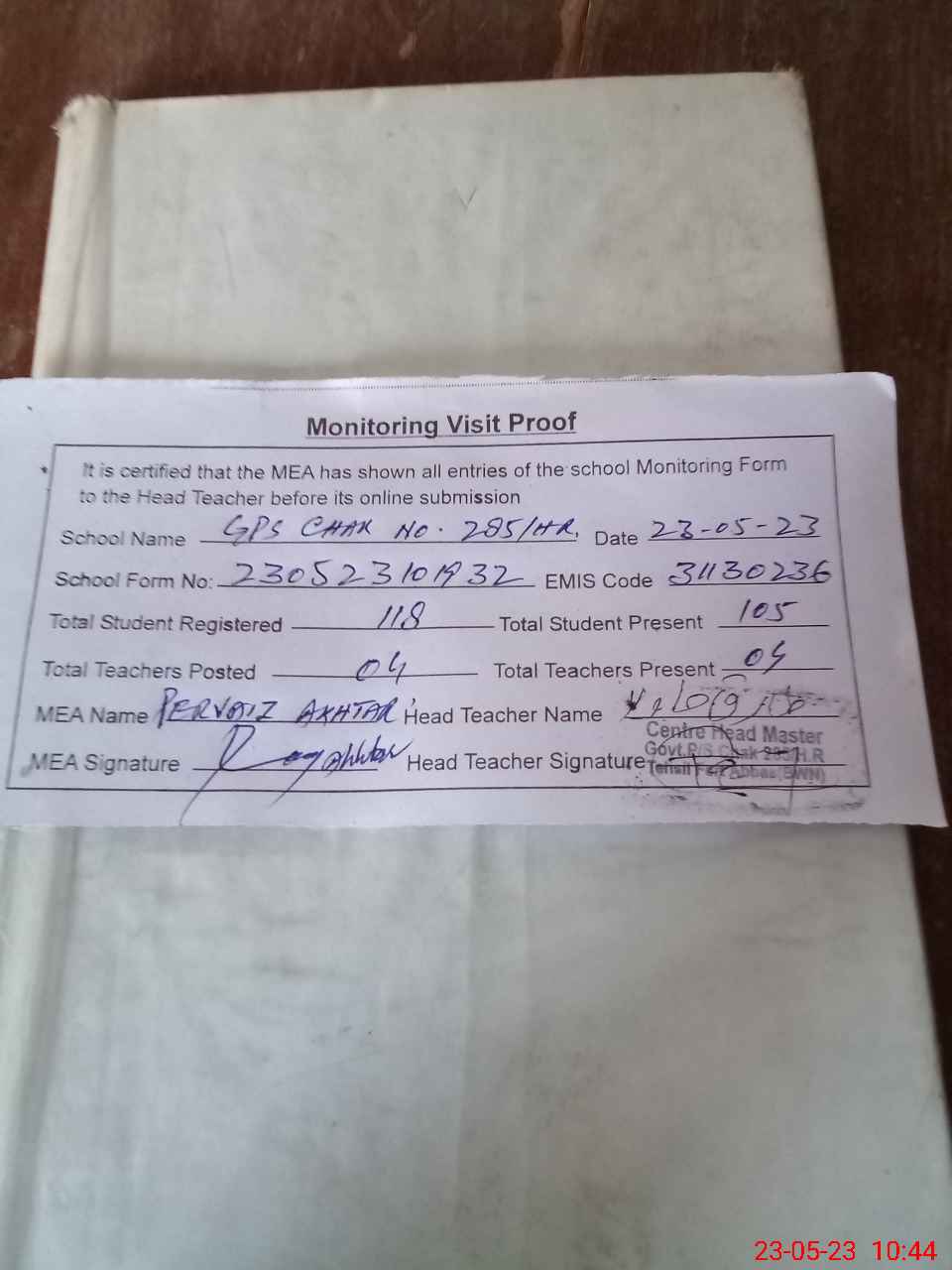 | EMIS Code: 31130236 | Name of School: GPS CHAK NO 285 HR | |||