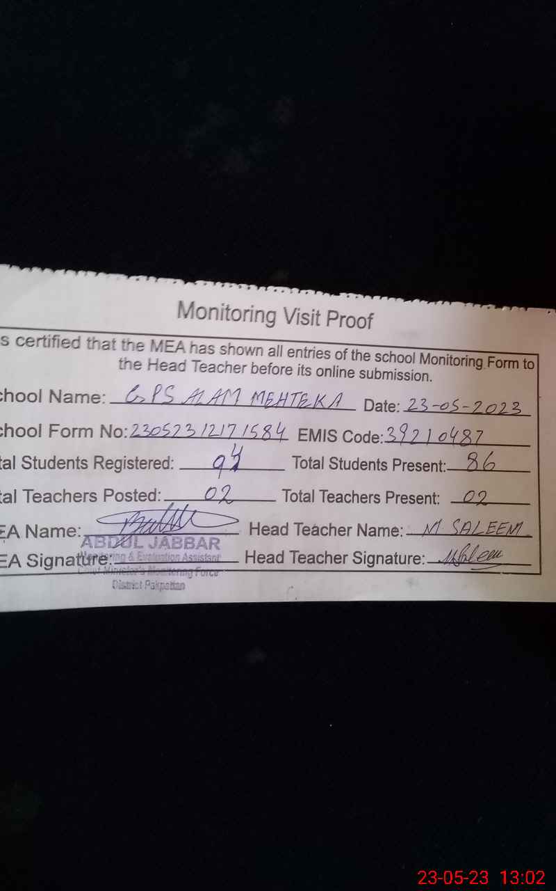 | EMIS Code: 39210487 | Name of School: GPS ALAM MEHTEKA PO PAKPATTAN | |||