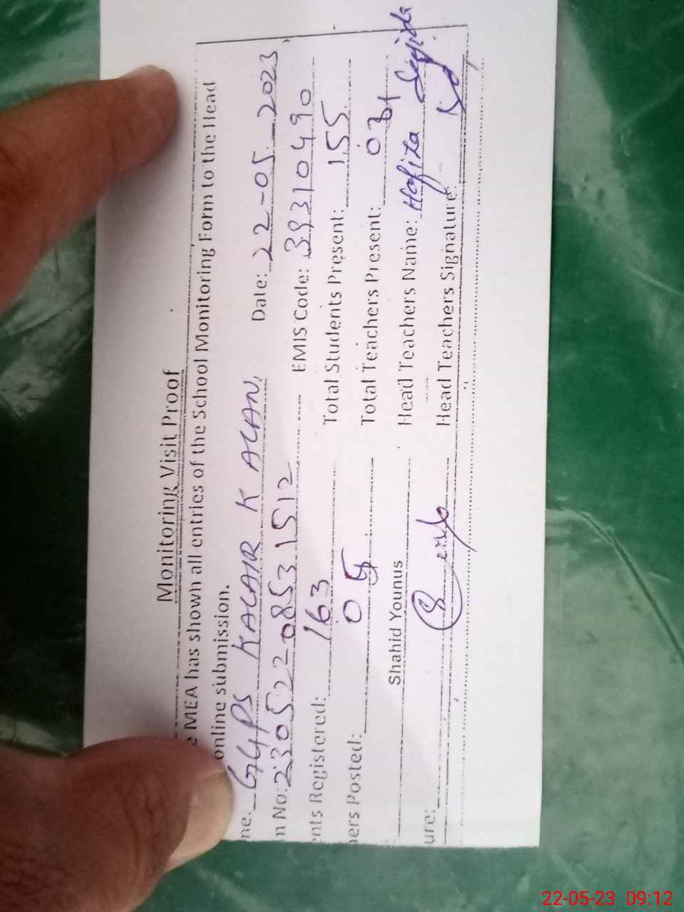 | Attendance Register | Head Teacher | MEA with School | Visit Proof |