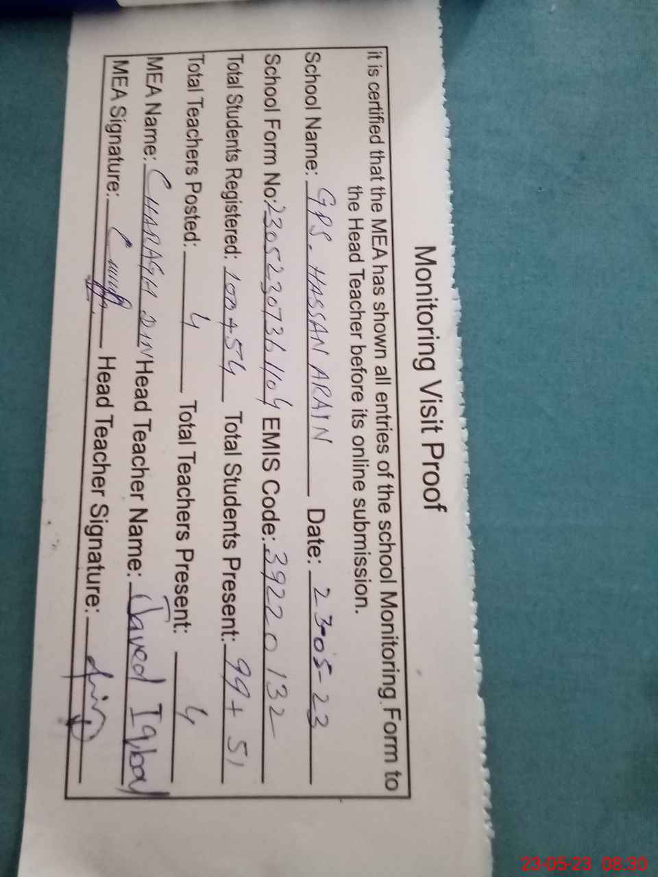 | Attendance Register | Head Teacher | MEA with School | Visit Proof |