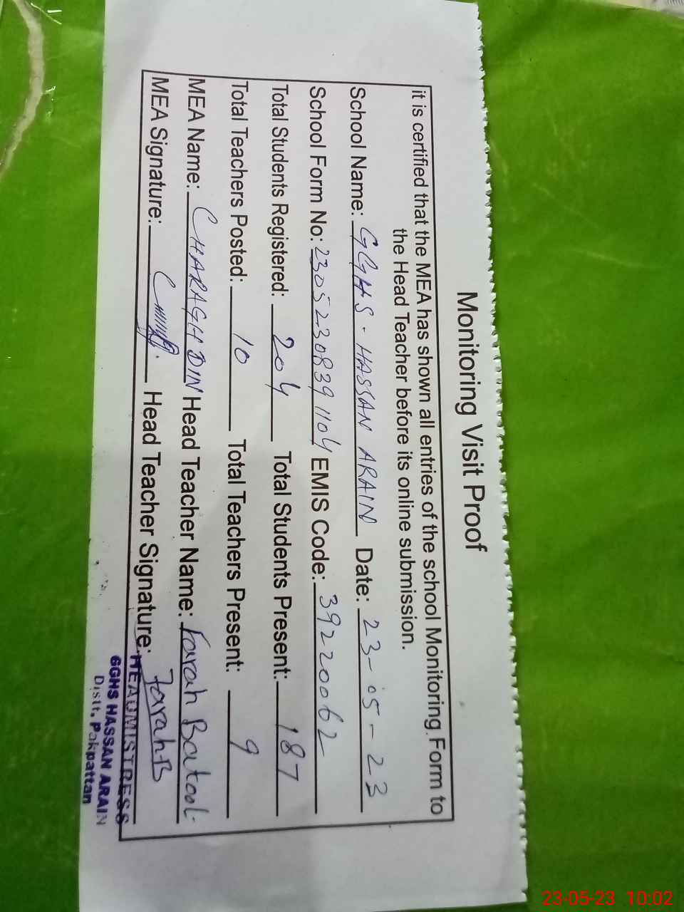 | EMIS Code: 39220062 | Name of School: GGHS HASSAN ARAIN | |||