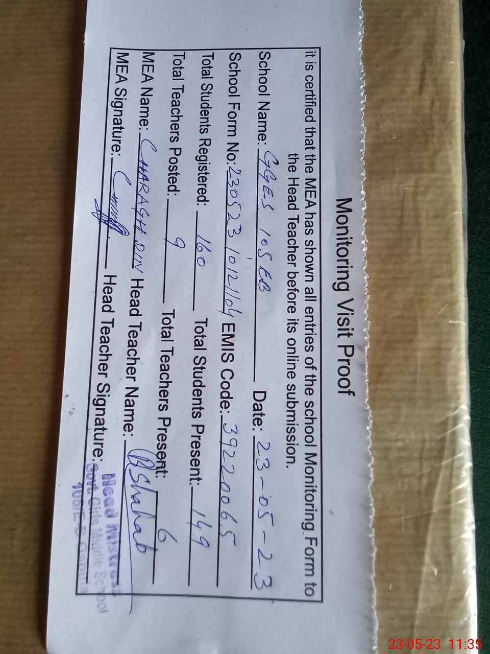 | Attendance Register | Head Teacher | MEA with School | Visit Proof |