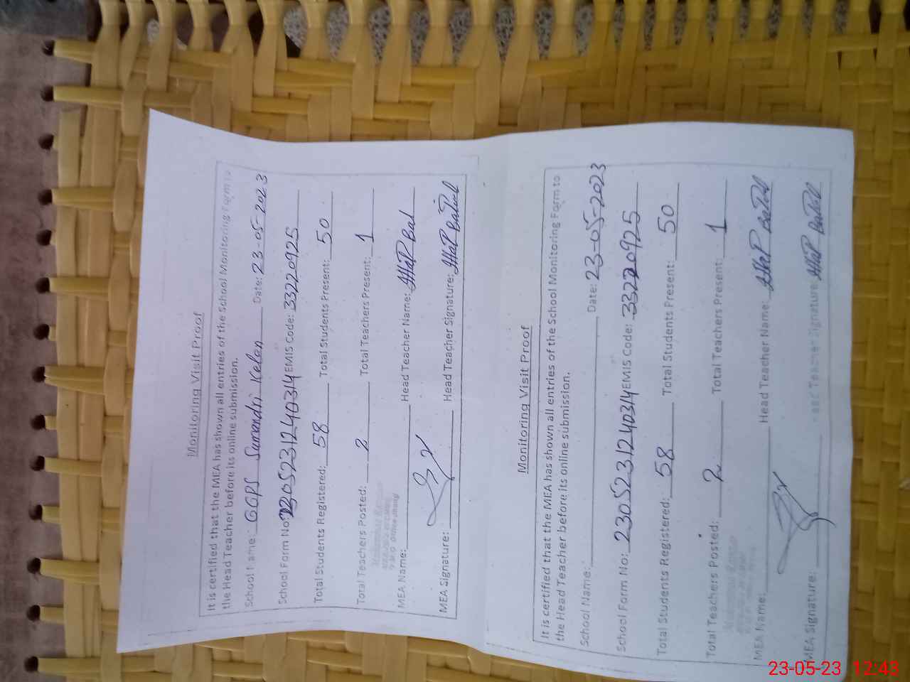 | Attendance Register | Head Teacher | MEA with School | Visit Proof |