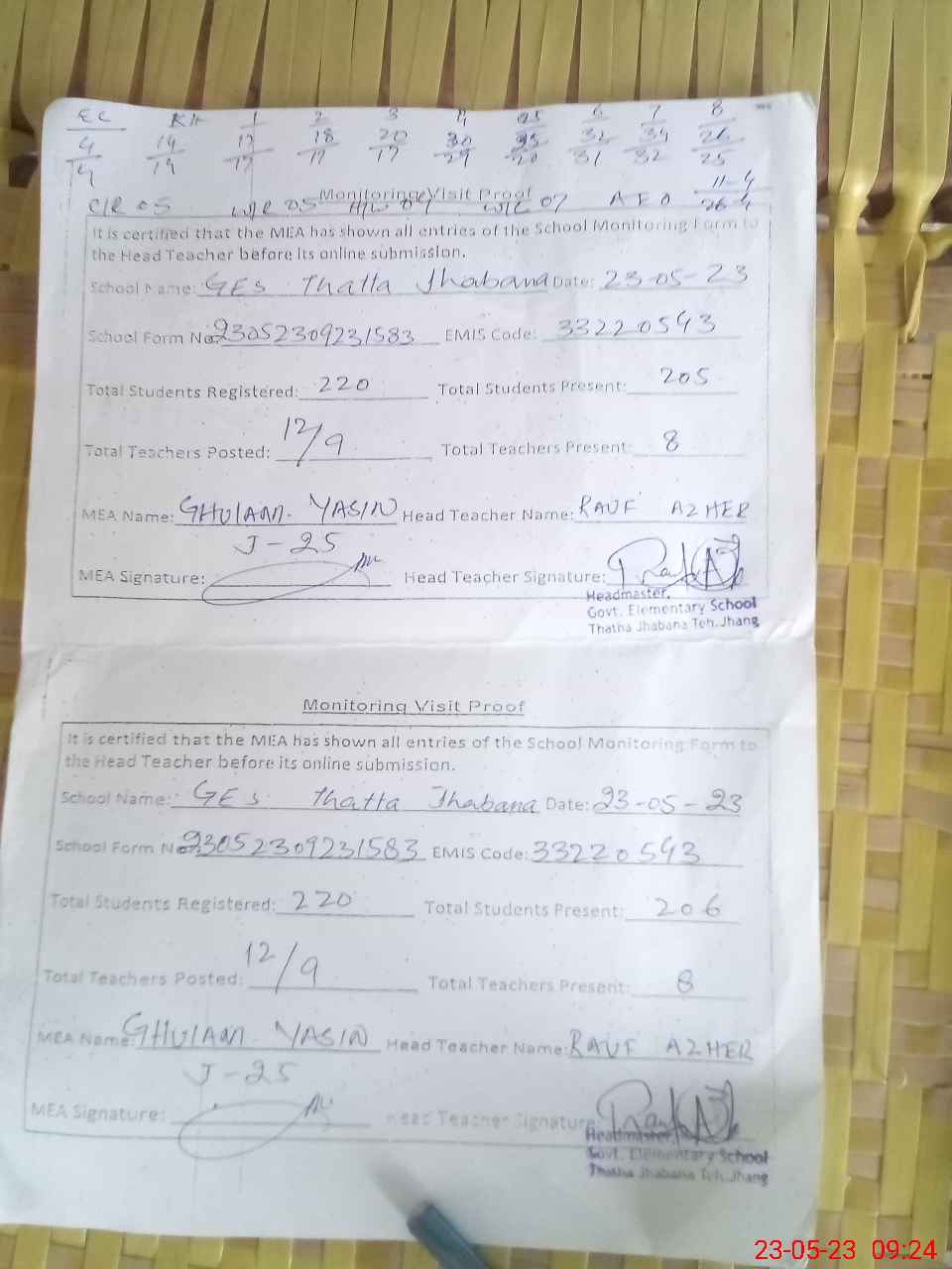 | Attendance Register | Head Teacher | MEA with School | Visit Proof |